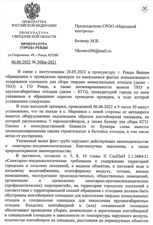 Прокурором города 6,06.2022 в адрес Главы ГО Ревда внесено представление об устранении нарушений федерально