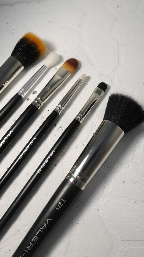 Кисти позволяют добиться плавности линий и переходов, подчеркнуть овал лица, скорректировать форму бровей, сделать акцент на глаза и подправить линию губ. Рассмотрим популярные кисти и фирмы, более подробно: Глаза и брови: -Valeri-D Кисть для теней (волос козы) С067. Кисть из натурального ворса козы, они подходят для тушевки теней, верхнего века. -Valeri-D Кисть для теней (волос козы) С067. Кисть из натурального ворса козы, они подходят для тушевки теней, верхнего века. -Valeri-D Кисть для теней (волос козы) 5М-813Д0. Данную кисть называют бочонок, они также подходят для нанесения теней, чаще всего используют для нижнего века и уголков. Можно использовать для нанесения как сухих теней, так и кремовых. Но лучше всего для сухих, так как кисть из натурального ворса. Тон, румяна и консилер: -Valeri-D Кисть из таклона Т271(синтетическая), Valeri-D Кисть из нейлона 22М- 3/8110 (нейлон и коза). Данные кисти подойдут для нанесения тона. -SHIK Кисть для макияжа 04. Отлично работает с сухими тек