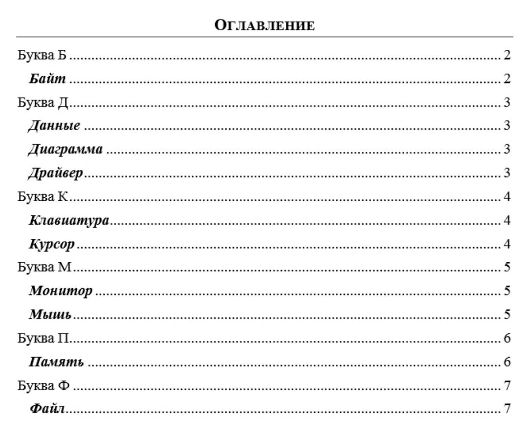 кликните по кнопке «Оглавление» и выберите подходящий вариант) 4. По мере выполнения задания (если появляются какие-либо изменения) необходимо обновлять список оглавления. Для этого нужно просто нажать на оглавление, там будет надпись"обновить". Ссылка на скачивание моего собственного словаря терминов с оглавление по информатике: https://drive.google.com/drive/fol