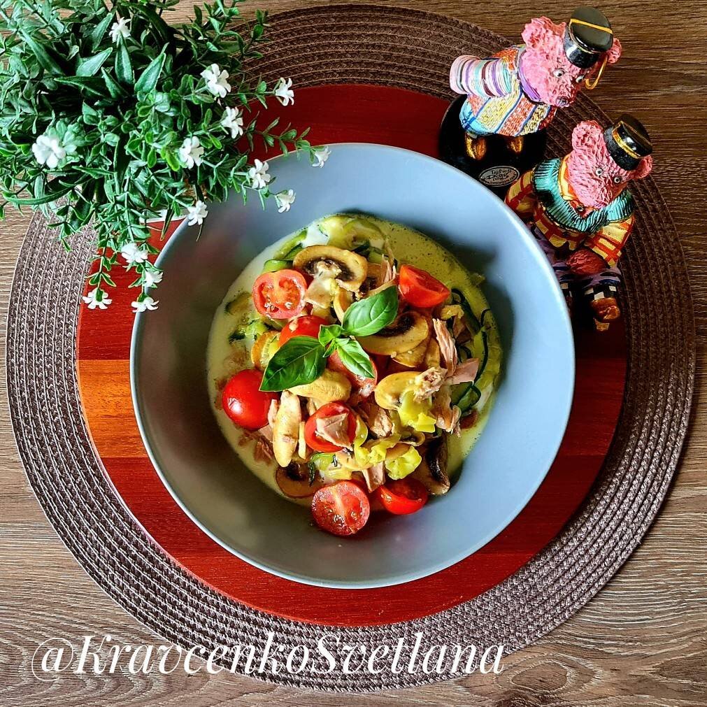 #летнееменю Кабачки вместо спагетти. Цукини с тунцом - прекрасное блюдо в летнем меню. Это действительно вкусно, здорово и быстро! Ингредиенты: шампиньоны, качок (цукини), тунец (консервированный), помидоры черри, соль, специи, чеснок, моцарелла, растительное масло Способ приготовления: Шампиньоны режем и обжариваем на растительном масле пока не испарится жидкость. Цукини нарезаем тонкими полосками и отправляем к грибам. Обжариваем вместе пару минут. Приправляем по вкусу, добавляем чеснок, томаты и тунец, аккуратно перемешиваем, обжариваем 2 минуты, солим по вкусу. Выкладываем моцареллу, перемешиваем и сразу подаем. Приятного аппетита!