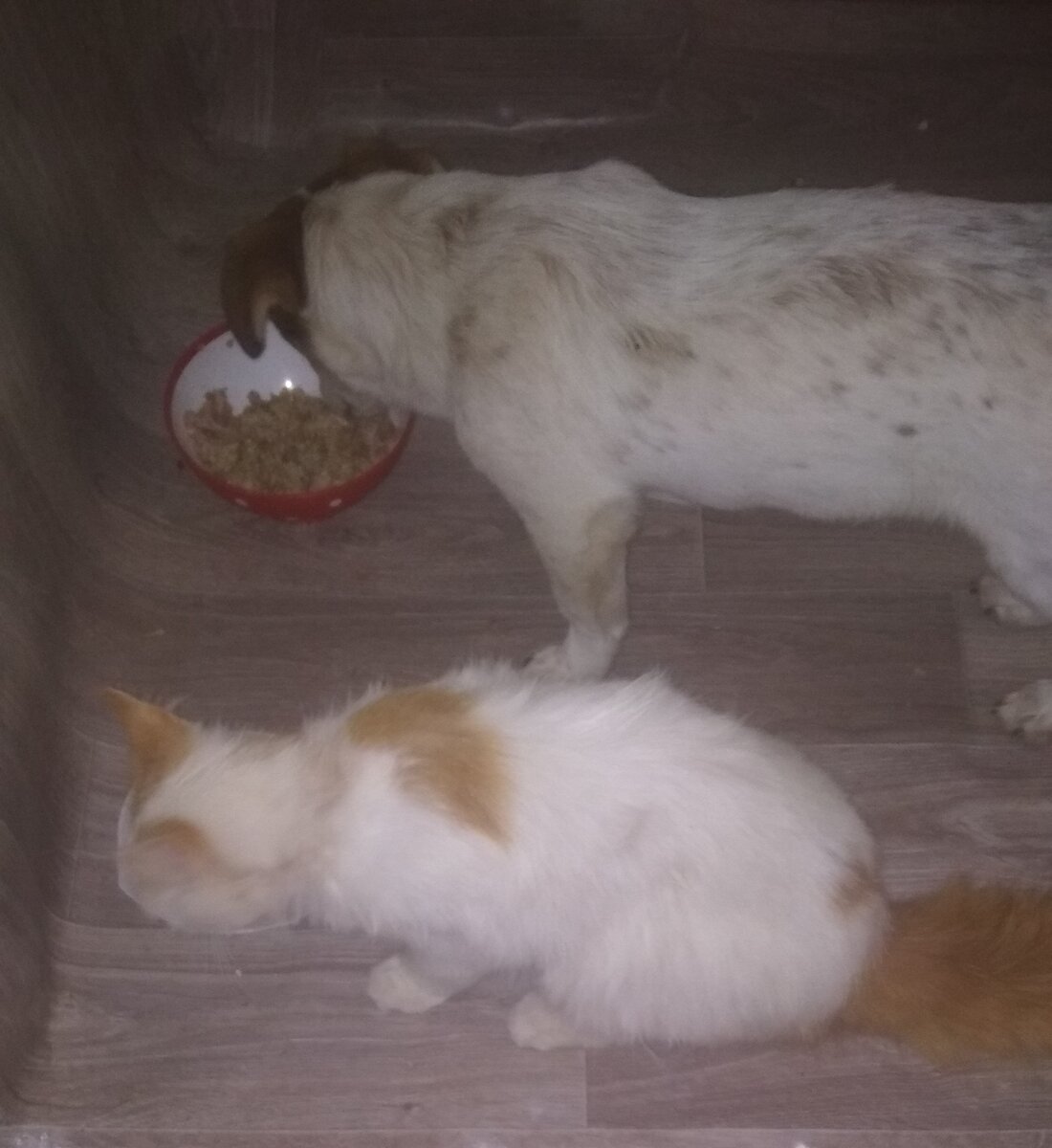 Данную статью решила добавить в защиту щенка и "ухайдаканного" кота. Замусолен Персик по одной простой причине - его всё устраивает. А выдранный пух на шее говорит лишь о том, что у Лопа чесались молочные зубы, которые у щенков достаточно острые. Кот иногда возмущался, но всё равно сам приходил и демонстрировал себя Лопу. Игры играми, но из за еды они не ссорятся. Вот кот поглядывает в миску Лопа, а вдруг там что то более вкусное? 6.23 - едят мясо 6.25 - Лоп наелся и ушел. Персик залез в чужую посуду для проверки. Вернулся к своей миске. 6.28 -Персик продолжает пропитание. Лоп наелся и следит за котом. 6.33 - кот продолжает напираться. Лоп смотрел - смотрел, потом ему надоело и он ушел в тазик грызть косточку. Лоп просит меня держаться подальше)) Могу добавить, что Ипкинс никого близко не пустит к своей порции. Поэтому напомню слова Атоса: " не судите опрометчиво", говорят Евангелие и господин кардинал ))