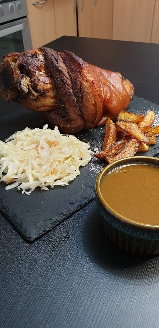#свинина #мясо #сочно #готовка #еда Ингредиенты: Свиная голень , Квас , Лук , Морковь , Тимьян , Смесь перцев (белый, черный, красный, душистый), Морская соль , Лавровый лист , Апельсин , Чеснок , Мед , Горчица , Сливочное масло Способ приготовления: Свиную голень обжарить газовой горелкой, поместить в кастрюлю. Морковь и лук нарезать хаотично, также обжарить горелкой и поместить в кастрюлю к голени. Также в кастрюлю добавить цедру апельсина, тимьян, смесь перцев, лавровый лист, соль и залить квасом. Довести рульку до кипения и томить на низком огне 2-3 часа. После этого достать рульку из кастрюли и процедить бульон через сито. Далее смешать сок апельсина, натертый чеснок, мед и немного бульона от рульки и перемешать. Смазать рульку соусом и отправить в духовку на 35 минут при температуре 180 градусов. Оставшийся бульон выпарить, добавить горчицу, сливочное масло и перемешать до однородной консистенции – получаем соус к мясу. В качестве гарнира используем квашеную капусту и жаренную ка