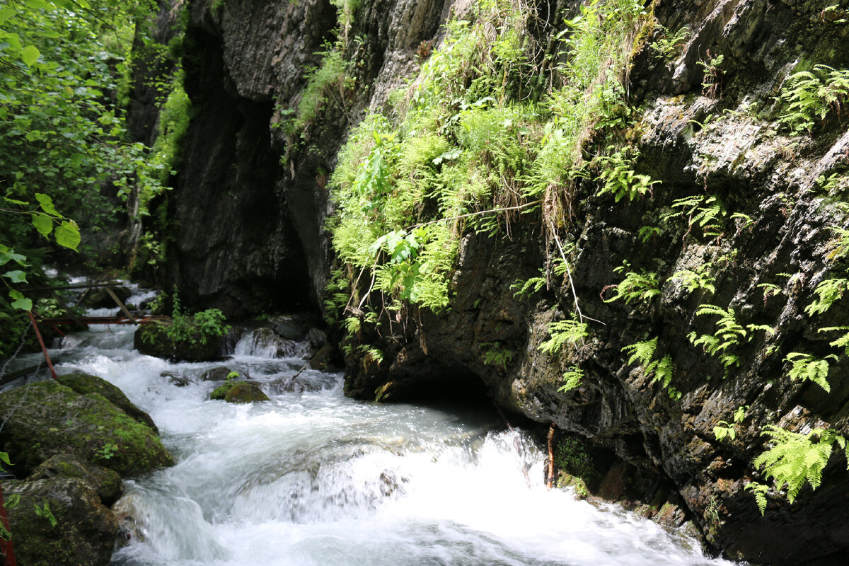 Тропа вдоль речки Ляжги поднимается довольно высоко над руслом, потом снова спускается к воде и упирается в самый настоящий каньон. Эдакое узловое место, людей скапливается довольно много. Во-первых, мост и лестница наверх, в вторых, просто красиво. Обходим каньон поверху, периодически встречая группы, идущие навстречу. Судя по их счастливым лицам, цель действительно стоящая.