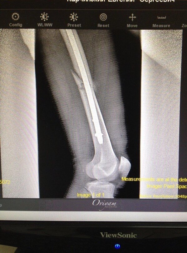 Итак, конец мая 2015. Мужа доставляют в больницу города Сочи с переломом бедренной кости. По факту удар был довольно локальный и кусок кости просто выбило. Такое собирается на штырь, сказали врачи, и на вторые сутки после операции начинаешь ходить. Ни тебе гипса, ни аппаратов каких то, ни спиц. Но, разумеется, врачами было предложено два варианта штыря, которые имели разную стоимость, что называется по хуже и неимоверно прекрасный! Короче, почти все что муж заработал он отдал за установку титанового штыря себе в ногу🤦🏼♀️ как и было сказано врачами через два дня он встал на ноги и с помощью костыликов стал ходить. В больницах Сочи долго не держат, там врачи собаку съели на этих переломах и там просто конвейер подобных случаев. К сожалению, фото перелома нет, но есть фото рентгена после установки конструкции. Красиво, да? Как ничего и не было... Муж вернулся, передвигаясь на костылях. В аэропорту не пищал, проходя через рамку😂 Далее пришло время решать вопрос с нашим прекрасным ф