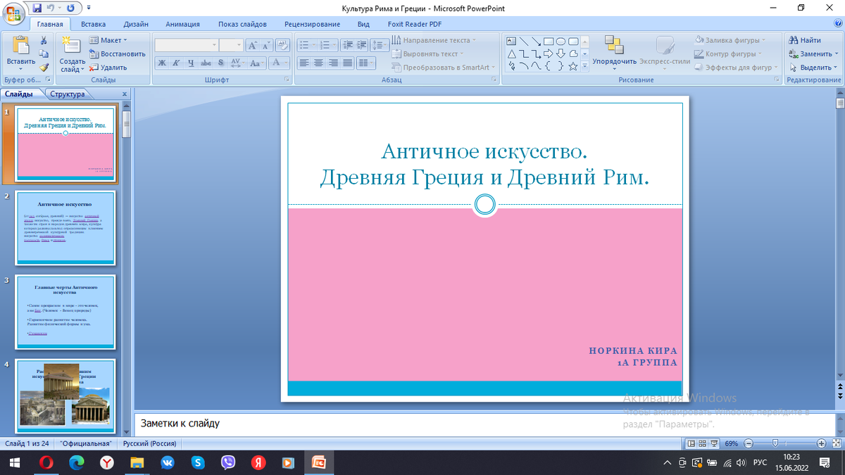 Моя одна из самых первых работ. Не самый лучший пример для оформления презентации. Как видно, титульный лист оформлен неправильно. В самой презентации много картинок, но не подписаны внизу Идея этой презентации это сравнить две культуры - Рима и Греции. Именно поэтому приводятся разные памятники культуры. Более подробно познакомиться с презентацией можно перейдя по ссылке ниже. Дополнительного текста для представления не прилагается.