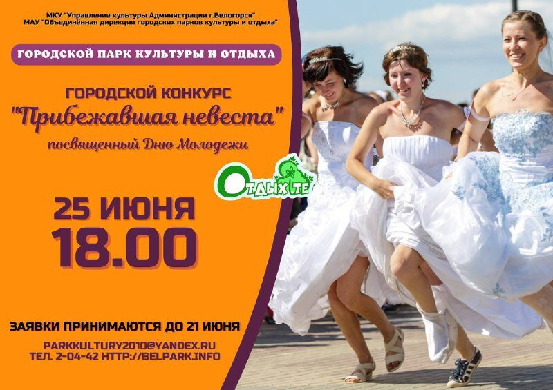 Невесты Белогорска посоревнуются в скоростном забеге «Прибежавшая невеста». Его устроят 25 июня в городском парке культуры и отдыха в рамках празднования Дня молодежи и проекта “Отдыхайте”. ― Поучаствовать в конкурсе могут девушки от 18 лет и старше, ― рассказала заместитель директора по культурно-массовой работе Оксана Черкасова. ― Обязательное условие - наличие свадебного платья, а также оригинальность, отличное настроение, желание всех удивить. Торжественное открытие конкурса состоится в 18.00 в городском парке культуры и отдыха. ― Невесты побегут от центральной трибуны стадиона парка и далее по беговым дорожкам стадиона по строго отведенному и обозначенному лентой маршруту, ― отметила Оксана Черкасова. ― Победителей забега определят по порядку прихода на финиш. Самая быстрая получит в подарок сертификат на приобретение ювелирных изделий. Для участия в конкурсе необходимо подать заявку до 21 июня в письменном или электронном виде по адресу г. Белогорск, ул. Набережная, 166, телефон