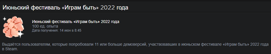 В Steam стартовал июньский фестиваль «Играм быть», который продлится до 20 июня 20:00 МСК. В рамках мероприятия игрокам доступны сотни демоверсий еще не вышедших проектов. Фестиваль «Играм быть» — многодневный праздник, в котором участвуют сотни демоверсий игр, проводятся трансляции разработчиков и обсуждения с ними игр, которые готовятся к выпуску в Steam. Можно даже получить значок летнего фестиваля «Играм быть» 2022 года. Для получения необходимо сыграть в любую демоверсию с фестиваля «Играм быть». Повышайте уровень значка, пробуя демоверсии. Каждая демка - даёт вам 10 опыта. Всего можно получить 100XP за 10 запущенных демо игр. Больше опыта начисляться не будет, к сожалению.