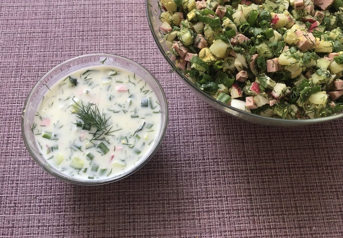 Какой самый популярный холодный суп, с которым ассоциируется лето? Ну конечно же окрошка. Сколько хозяек столько и рецептов. Окрошку готовят на квасе, сыворотке, кефире, минералке, тане, айране. На чем ее только не готовят. Часто случается, что в одной семье все члены семьи любят разную окрошку. Что же делать ? Как всем угодить? Очень просто - нарезать все ингредиенты, но не добавлять соль, горчицу, зелень, квас, кефир,... А уже перед подачей, отдельно каждому члену семьи добавлять в его тарелку, непосредственно перед подачей соль, горчицу, кефир, сыворотку, зелень (у каждого могут быть свои предпочтения в выборе зелени). А если кто то не хочет окрошки- добавляет майонез, сметану и соль - получается неплохой салат на ужин. Ингредиенты: картофель- 4 шт. редис- 250 г. огурцы- 250г. ( 4 средних огурчика) яйца - 6-7 шт. колбаса вареная- 250г. пучок зелени лука -50г. пучок зелени укропа- 50г. горчица соль перец кефир, тан - зависит от предпочтений Общее время приготовления