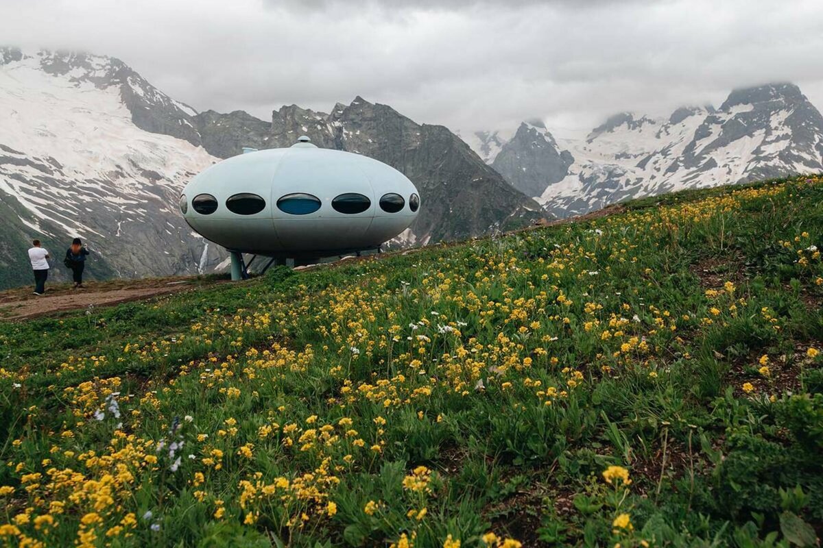 Вероятно, финский архитектор Матти Сууронен мечтал, что в будущем люди будут путешествовать между планетами и жить на космических кораблях. Поэтому в 1979 году на склоне горы Мусса-Ачитара построил для гостей Домбая гостиницу в форме летающей тарелки. Интересно, что она действительно способна перемещаться в пространстве: конструкцию можно разобрать на части, либо целиком, с помощью вертолета, перенести на другое место. «Тарелка» довольна компактная — она рассчитана на шесть-восемь человек, за 15000 рублей ее сдадут вам в аренду.