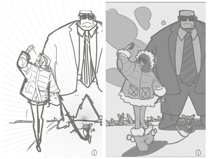 На первом скетче богатая девочка гуляет со своей собачкой, пока великан-телохранитель следит за её безопасностью. Персонажи занимают около 70% пространства изображения. Я нарисовал телохранителя, потому что подумал, что его гигантские пропорции создадут приятный контраст в сочетании с пропорциями девочки и её крошечной собачки.