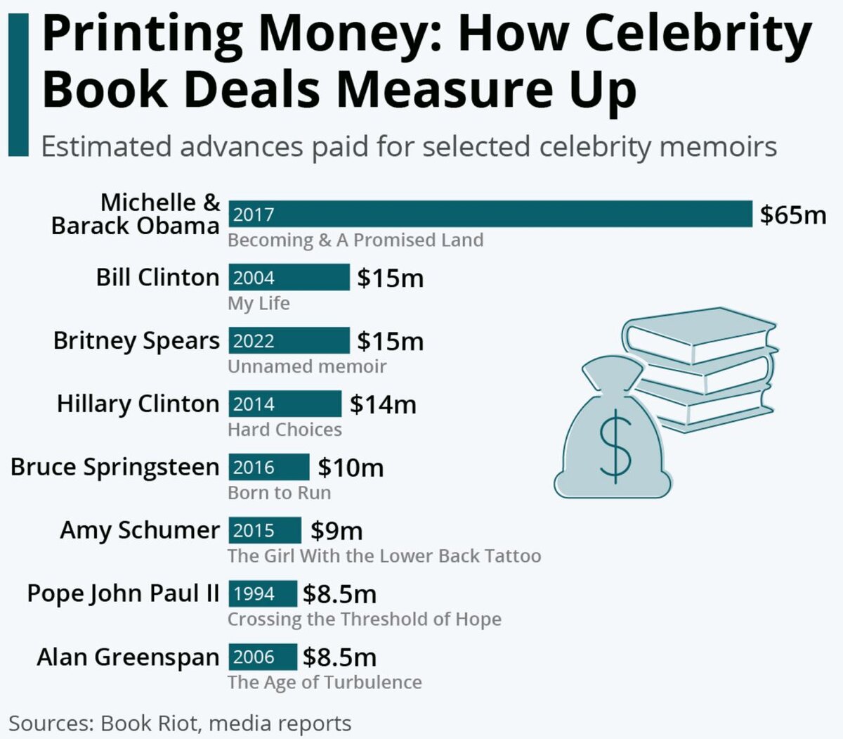 Всем привет👋 Сегодня разберем картинку об книгах о знаменитостях! Через три месяца после того, как в ноябре Верховный суд округа Лос-Анджелес прекратил 13-летнее опекунство Бритни Спирс, 40-летняя певица подписала выгодный книжный контракт с издательством Simon & Schuster. Говорят, что сделка по продаже откровенных мемуаров, о которой впервые сообщила Шестая страница, стоит не менее 15 миллионов долларов, что делает ее одной из крупнейших сделок с книгами о знаменитостях за всю историю. В прошлом Спирс неоднократно намекала на взрывоопасные истории, которыми она могла бы поделиться о своей семье, с которой она поссорилась из-за печально известного опекунства. Как видно из следующей диаграммы, сделка Бритни бледнеет по сравнению со сделкой на 65 миллионов долларов, которую Обама подписал в 2017 году, но она соответствует авансу Билла Клинтона в размере 15 миллионов долларов за “Мою жизнь”, в то же время едва обойдя Хиллари Клинтон, которая заработала 14 миллионов долларов за “Трудный в