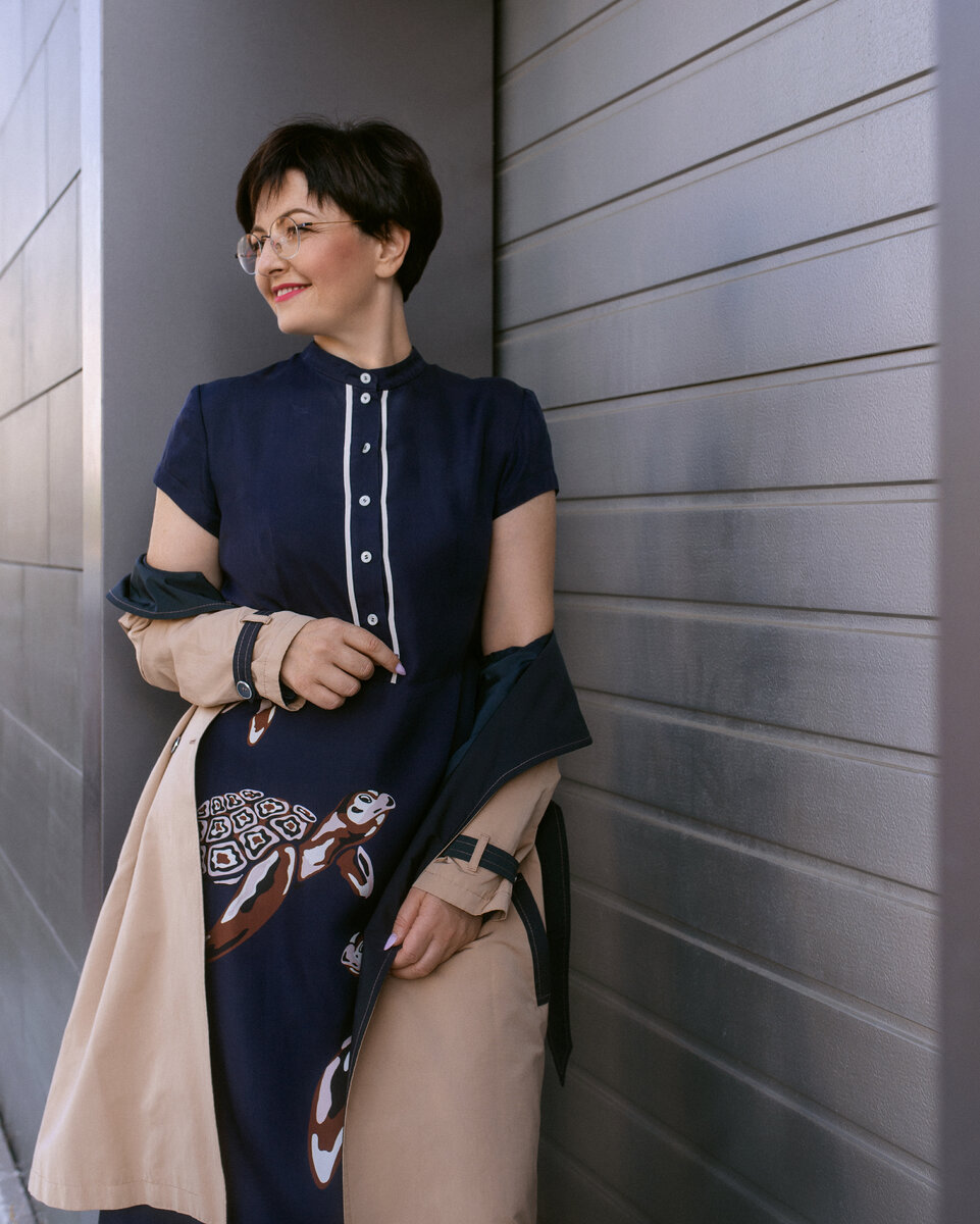 С Инной работаем уже давно - с 2017 года, и придумали и создали уже много интересных образов. С огромным удовольствием представляем вам серию фото на Инне Этот шелк, мне кажется, создан специально для Инны. 100% попадание в её внешность: насыщенные оттенки красного и сине-фиолетового, геометрический узор "с изюминкой" в сочетании с фасоном платья-рубашки с трапециевидной юбкой И светлый хлопковый тренч с рукавами реглан и акцентными роговыми пуговицами - как базовая вещь в гардеробе. Для наших клиентов всегда находим самое лучше 👌 И конечно, всегда отталкиваемся от внешности самого клиента - это для нас главное и основное 🙌 Раскрыть индивидуальность каждой. Специально для Инны создали это платье - все в нем идеально подходит Инне: и насыщенный синий цвет (учитывая высокий контраст внешности) и выбранный силуэт и форма (мягко подчеркивающая силуэтные линии фигуры) и многодетальность в портретной зоне - планка, воротник-стойка и контрастные светлые канты. И, конечно, изюминку всем