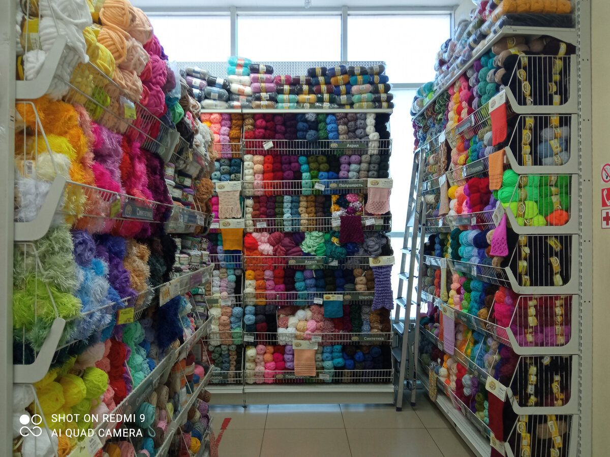 На самом входе в магазин первым делом бросается в глаза несколько рядов стеллажей с разнообразным великолепием пряжи.. Глаза разбегаются от ярких цветов и многообразия выбора.