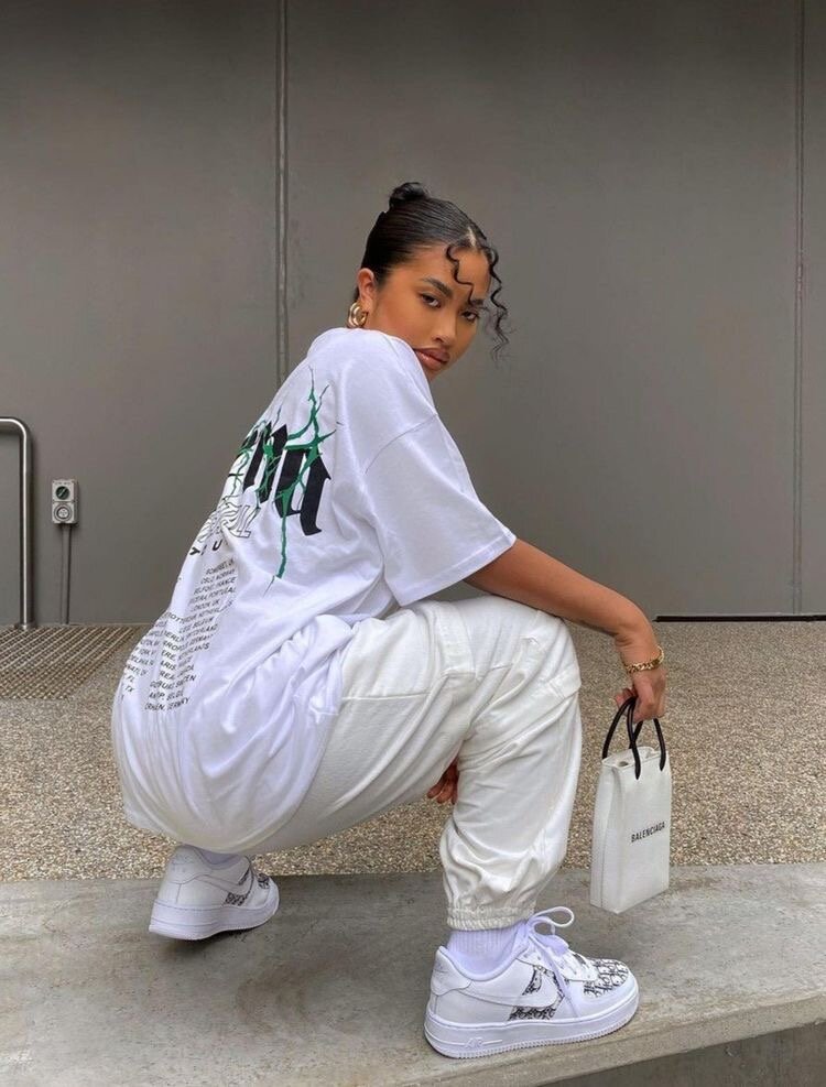 СМЕЖНЫЕ ОТТЕНКИ Белую оверсайз футболку хорошо сочетать с близким по тону оттенками, например с молочным, бежевым, светло-серым. Это же правило «смежных оттенков» работает и в обратную сторону - белый низ и его тональные изменения на верху. TOTAL LOOK Тут всё понятно, главное приблизительно попасть в общий тон, тогда образ будет смотреться гармонично. Принты и аксессуары отлично разукрасят этот холст. ШОТРЫ + ОВЕРСАЙЗ ФУТБОЛКА Спросите гуру стритстайла и они вам расскажут с чем в первую очередь нужно носить футболку - с шортами конечно! С ДЖИНСАМИ (трубы/клёш) Это классика, «джинсы футболка» всем знакомое выражение. Со светлыми джинсами особенно хороши белые, разноцветные футболки, пастельные оттенки. НЕЙТРАЛИЗУЕМ ЯРКОСТЬ Надевая яркие сочные цвета погасите это торжество нейтральным противовесом. Такой смелый контраст определено соберёт много взглядов и подчеркнёт ваш интеллект в гардеробе - знание цветовых пропорций. ФУТБОЛКА + СПОРТИВНЫЕ ШТАНЫ Еще одна альтернатива