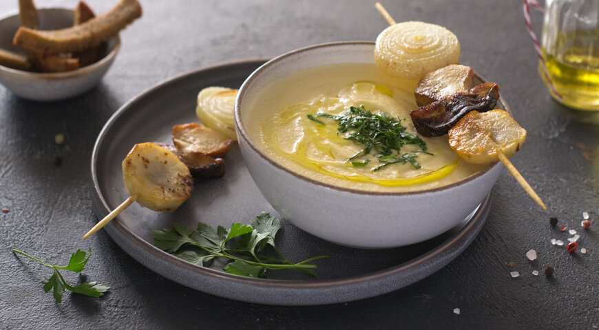 Растопите сливочное масло в кастрюле среднего размера на сильном огне, добавьте чеснок и лук и готовьте до мягкости, около 2 минут. Добавьте топинамбур и обжарьте около 2 минут. Добавьте бульон и варите на медленном огне, пока не станет мягким. Добавьте сливки и снова доведите до кипения. Посолить и поперчить. Пюре взбить в блендере до однородной массы. Процедить через мелкое сито. Держись в тепле. Посыпать зеленым луком. Подавать.