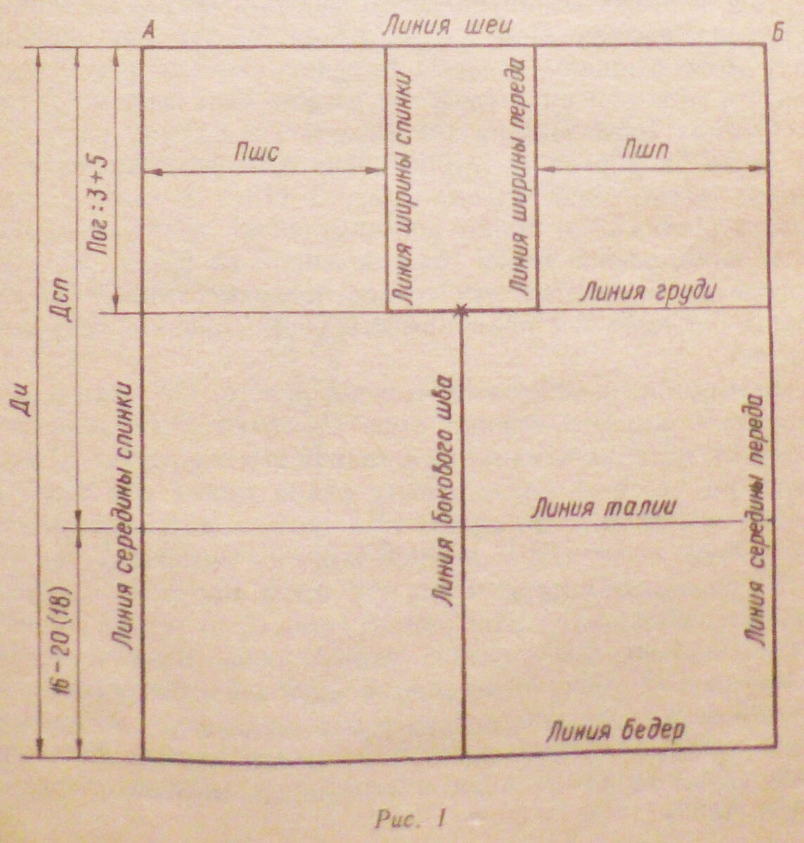 Еще ниже проводят линию бедер - по линии середины спинки вниз отмеряют 16 -20 см в зависимости от роста. От полученной точки вправо проводят горизонтальную линию до линии середины переда. На рис.1 линия бёдер совпадает с линией низа. Завершают сетку последними несколькими линиями. Линия ширины спинки - от точки А вправо по линии шеи отмеряют расстояние, равное мерке Пшс (19). Из полученной точки вниз проводят вертикальную линию до линии груди. Затем— линия ширины переда. От точки Б влево по линии шеи отмеряют расстояние, равное мерке Пшп (19), и из полученной точки вниз проводят вертикальную линию до линии груди. При этом прокладывают линию бокового шва: расстояние между линией ширины спинки и линией ширины переда по линии груди делят пополам (крестик обозначает деление отрезка пополам) и из полученной точки опускают вниз вертикаль до линии низа.