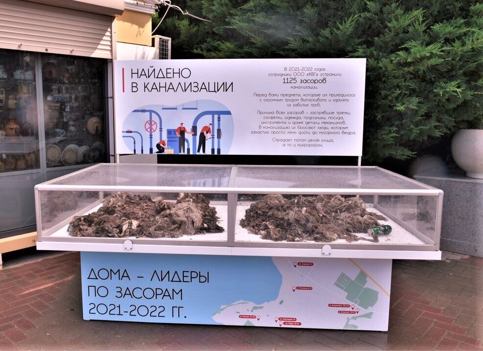 Это наглядно подтверждает стенд, подготовленный сотрудниками Концессии. Под стеклом собрана только часть того, что сотрудники Концессии практически ежедневно достают из канализации – салфетки и тряпки. Чтобы ликвидировать такой засор, специалисты ООО «КВГ» применяют сложную технику, что затратно как финансово, так и по времени.