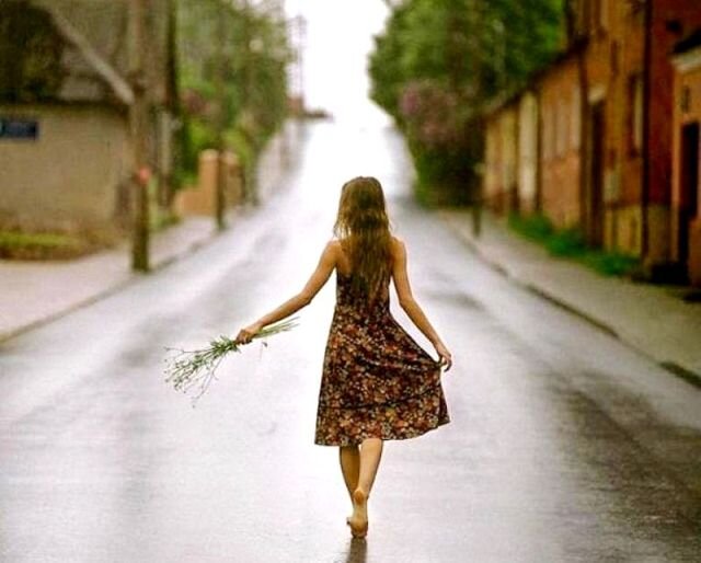 Только что прошел дождь, в воздухе пахло свежестью. Ему навстречу по улице босиком шла девушка с распущенными влажными волосами. Похоже, что она попала под дождь.