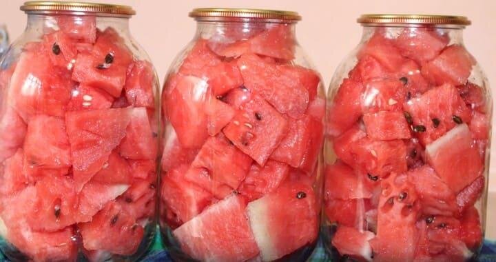 Начинается лето в магазинах стали появляться первые арбузы. Этот сладкий вкус мы ждём целый год, чтобы снова в августе или в сентябре наесться досыта этой безумной ягодой. Но как оставить этот вкус на зиму? Зимой покупать - это бессмысленно арбуз будет уже не таким сладким, и очень дорогим, как нам хотелось бы, но есть одно решение можно замариновать арбузы в банке и опустить в погреб. Для этого есть очень простой рецепт. На одну трёхлитровую банку понадобится: очищенные и порезанные арбузы, три столовые ложки сахара, одна столовая ложка соли и одна столовая ложка 70% уксусной эссенции. Нужно поставить небольшую кастрюльку объёмом 3-4 л на газ залив воды. В кипящую воду наложить нарезанные арбузы. Ошпарить 5 минут в кипятке и шумовкой достать куски арбуза на поднос, а в воду наложить новые куски арбуза. С подноса переложить куски арбуза в стерилизованную банку, наложив до половины добавьте туда соль сахар и уксусную эссенцию дальше доложить банку доверху арбузом. Никакой рассол и