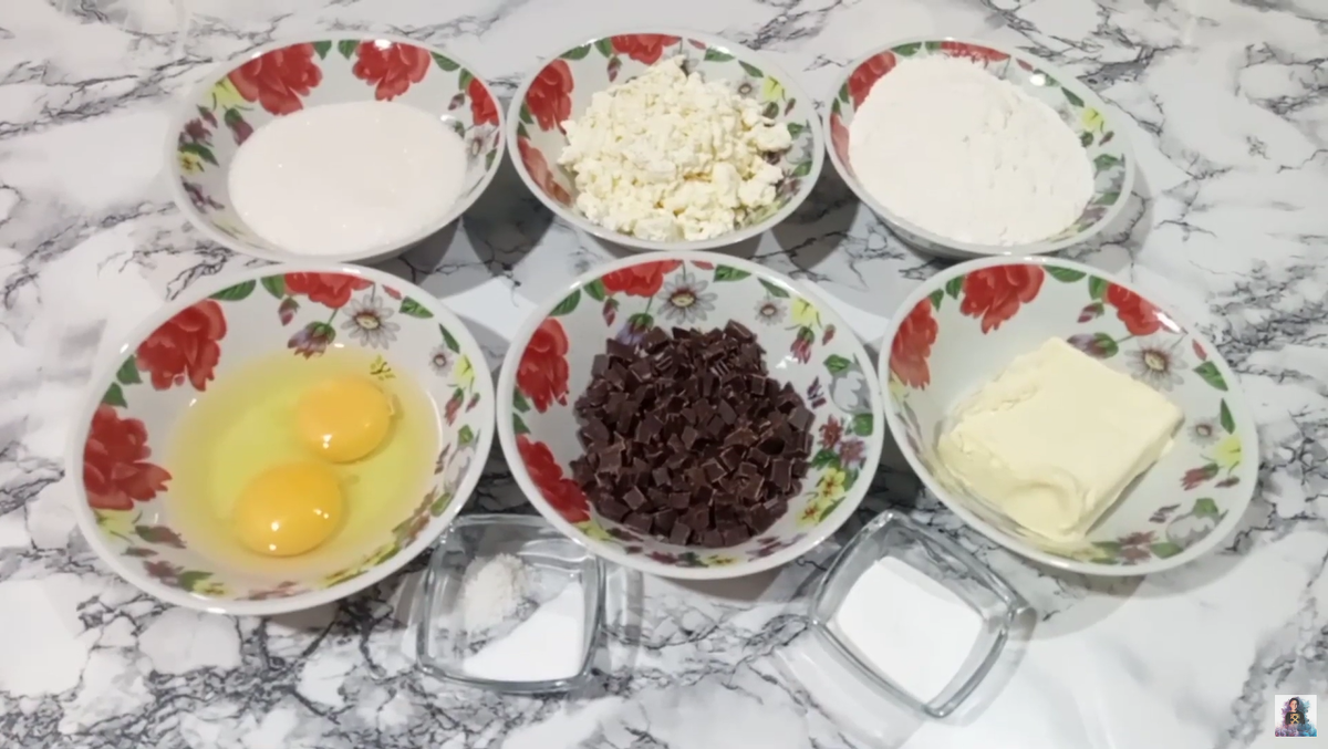 Всем привет ! Сегодня у нас с вами очень вкусная выпечка ! Перед просмотром рецепта , подпишитесь . Дочитав рецепт если он вам понравится поставьте лайк , напишите комментарий и поделитесь рецептом с друзьями ! Начнем ! Понадобится : Сахар - 150 г . Творог - 180 г . Мука - 180 г . Яйца - 2 шт . Шоколад - 90 г . Масло сливочное - 100 г . Разрыхлитель - 10 г . Соль - 1/4 ч.л . Ванилин - 1 ч.л. Приготовление ;