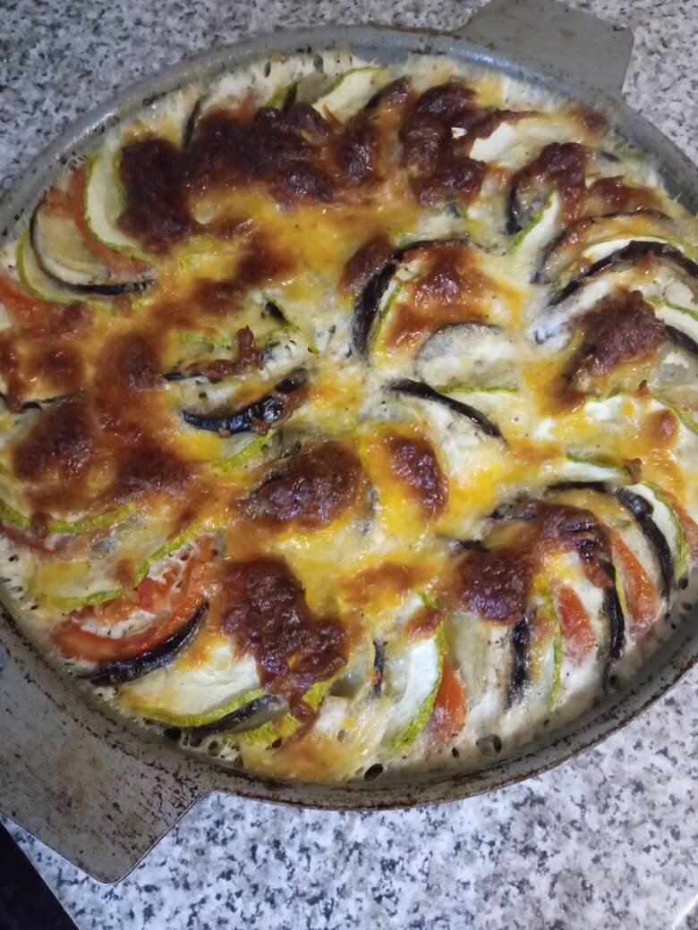 Ингредиенты: Кабачок, Баклажан, Помидоры, Картофель, Сыр твёрдый, Молоко, Яйца, Орех мускатный молотый , Масло растительное , Соль, Перец чёрный молотый Способ приготовления: Кабачок нарезать кружочками. Баклажан также нарезать кружочками. Соединить кабачок и баклажан, посолить, перемешать и оставить на 20 минут. Картофель очистить и нарезать кружочками. Помидор нарезать кружочками. Форму для запекания смазать растительным маслом. В форму выложить овощи, чередуя кабачок, баклажан, картофель и помидор, посолить и поперчить. Сыр натереть на мелкой терке. Соединить сыр с молоком, яйцами, добавить соль, перец, мускатный орех и перемешать. Залить сырной смесью овощи. Запекать в духовке 30-40 минут при температуре 200 градусов Цельсия. Приятного аппетита!