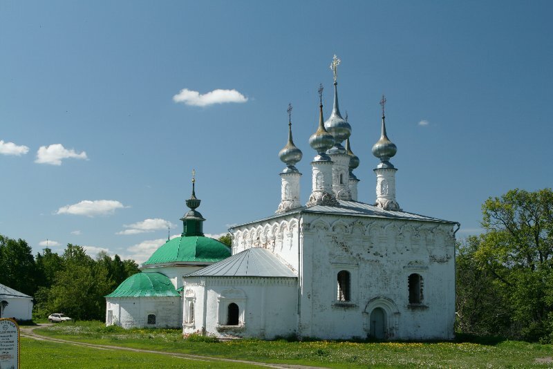 Любимый в России праздник Вербного Воскресенья носит и “официальное” название – день Входа Господня в Иерусалим. А веточки вербы, которыми в этот день украшены храмы, символизируют пальмовые ветви, которыми Иерусалим приветствовал Мессию. При том, что этот праздник на Руси всегда любили, храмов Входа Господня в Иерусалим сохранилось довольно мало. Одна из лучших таких церквей – Входоиерусалимская церковь в Суздале, в самом центре города, на Кремлевской улице. Красивая пара суздальских церквей – Входоиерусалимская и Пятницкая – расположена между Гостиным двором и оборонительными укреплениями кремля, в юго-западном углу Торговой площади. Как многие суздальские храмы, церковь Входа Господня в Иерусалим встала на место прежней деревянной. Предшественница этой церкви называлась Пятницкой и была снесена из-за ветхости. Эта “летняя” или “холодная” церковь, каких в Суздале немало, использовалась в теплое время года, когда не требовалось отопления. Первоначально она была пятиглавой, но так как