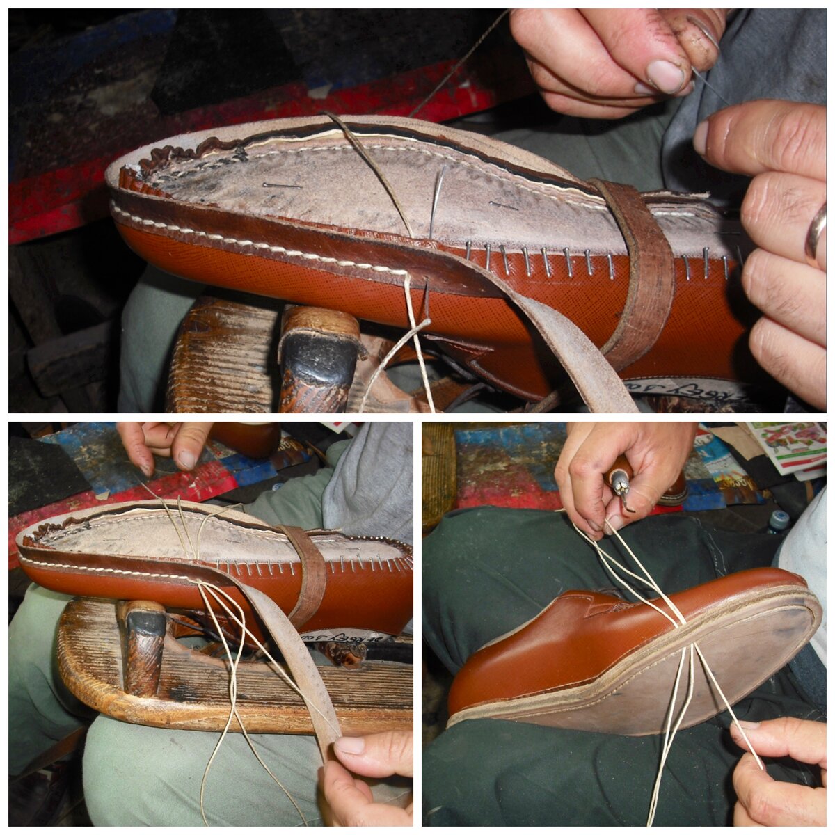 Вам понадобится: капроновая нить; гудрон или мыло; шило; тонкий крючок; ножницы. Шаги ремонта. Чтобы качественно прошить подметки в обуви, рекомендуется использовать капрон, толщина которого должна быть около 5 мм. Чтобы он в процессе не распушился, примените мыло или гудрон, после чего натрите его выбранным средством. Если у вас дома нет шила, то можно взять остро заточенную спицу. Крючок рекомендуется брать тонкий вязальный, если такого не имеется, то возьмите другой или используйте небольшой загнутый кусок проволоки. . Наметьте линию нового шва. Она должна задаваться от края подошвы внутрь не меньше чем на 0,5 см, так как нить через время сможет истончиться из-за трения об дорогу. Для точности прорисовки можно использовать портновский мел или кусочек мыла. Теперь нужно воткнуть шило в подошву там, где будет находиться первый стежок. Шило должно проходить сквозь подошву снаружи внутрь под углом, примерно 40-50 градусов. Входное отверстие должно находиться на внешней поверхности