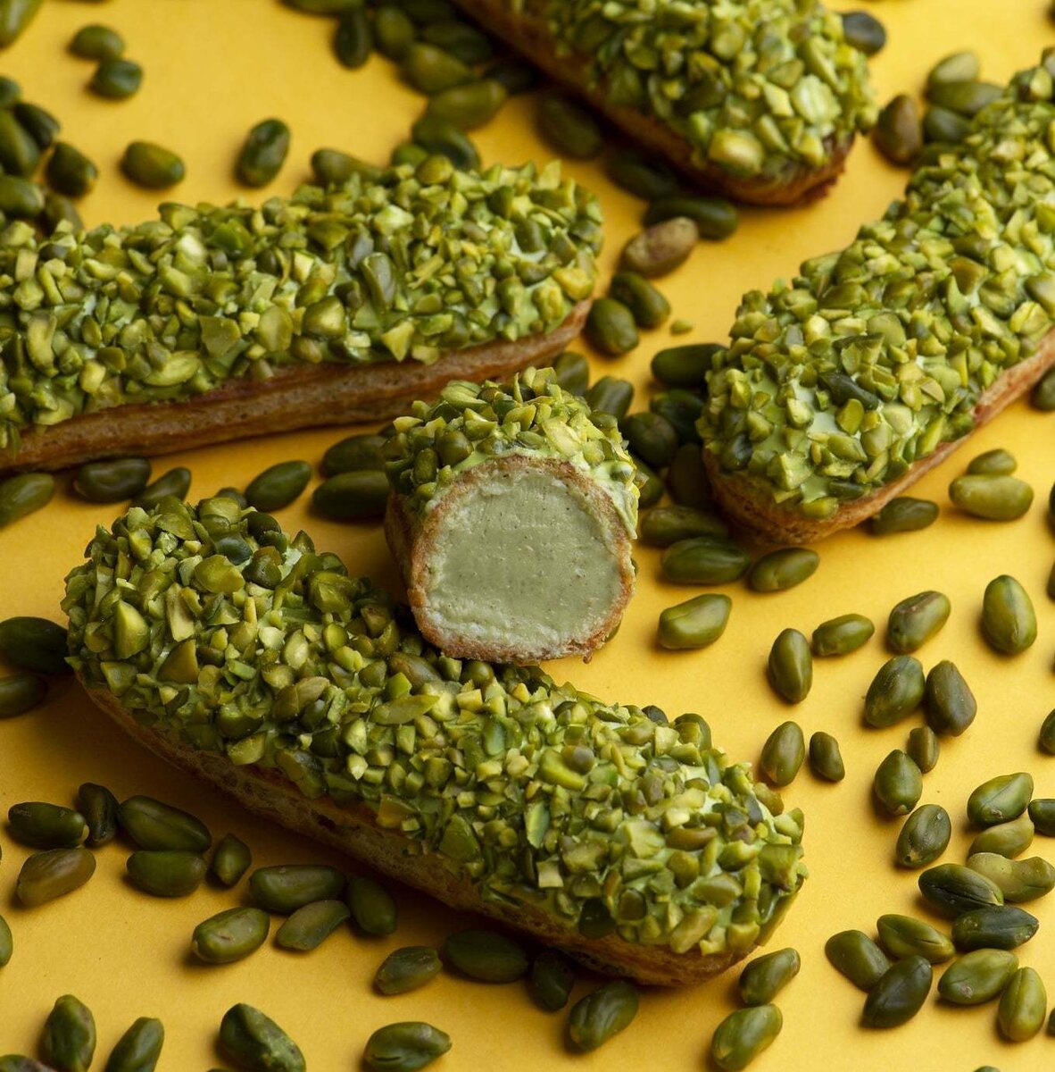 Очень вкусные фисташковые эклеры с нежным фисташковым кремом на маскарпоне и хрустящей корочкой из карамели, посыпанной фисташками. Рецепт фисташковых эклеров
