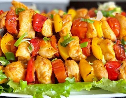 4. Нанизываем на шпажки куриное филе, чередуя с овощами;