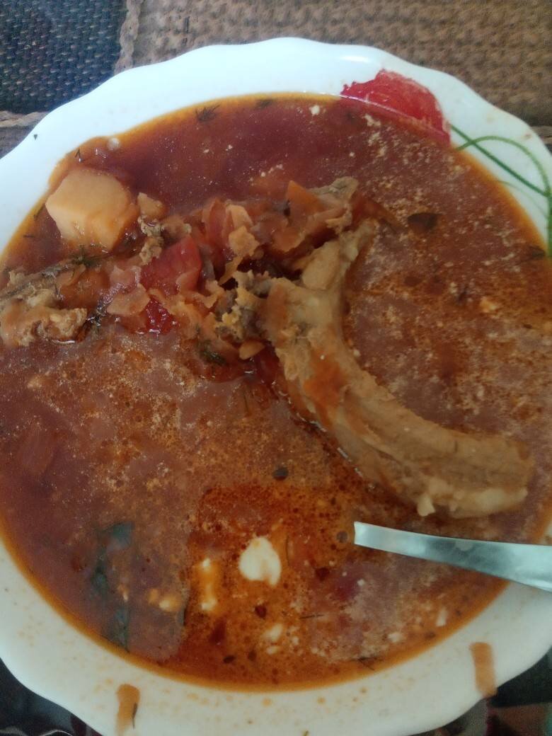 Ингредиенты: Свинины, Картофель, Буряка, Моркови, Лука, Укроп , Лавровый лист, Соль , Перец черный молотый, Томат пасты, вода Способ приготовления: Мясо промыть, и поставить варить до готовности 1-1.5 часа, после закипания убрать пену. Картофель нарезать кубиками и после приготовления мяса закинуть к мясу. Морковь и буряк натереть на крупной тёрке, лук нарезать мелкими кубиками. И все вместе тушить с томат пастой. После того как приготовилась картошка, закинуть зажарку, посолить, поперчить, добавить лавровый лист и укроп, готовить ещё минут 5. Борщ готов, подавать со сметаной. Приятного аппетита!