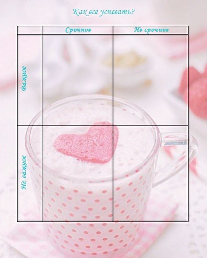 ⠀ Мы часто задаемся вопросом: «Где найти 25 час?», ведь живём в совершенно сумасшедшем мире с его безумно быстрым ритмом😱 ⠀ Хотела бы рассказать Вам об одном интересном инструменте, по управлению временем - «матрице Эйзенхауэра». ⠀ ☝🏻Главная идея состоит в том, чтобы быстро и эффективно распределить дела по степени важности и срочности. ⠀ Разбивается она на 4 группы: ☑️Срочные и важные - это вопросы жизни и смерти. ☑️Не срочные, но важные - это дела, которые требуют качественного и вдумчивого исполнения. ☑️Не важные, но срочные - это дела, которые отнимают много времени, но, по сути, не имеют никакого значения для дальнейшего развития ☑️Не важные и не срочные - это дела, не имеющие никакой важности. ⠀ Старайтесь распределять своё время ⌛️ в основном между важными делами, то есть между первыми двумя квадратами. ⠀ Те задачи, которые попали в третий и четвертый квадраты, 🗓могут быть выполнены после выполнения более важных. ⠀ Матрица отлично может подойти и для долгосрочного планирован