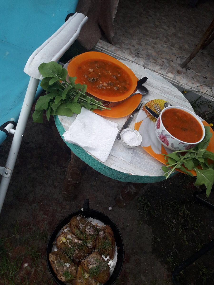 Привет, друзья! Хоть и были мы на даче всего несколько дней, но впечатлений у меня хватает. Вот, к примеру, сварила я на обед как-то рисовый томатный суп с фрикадельками. Обычно к супу всегда срываю много разной зелени, ибо на даче она в свободном доступе растет. Вот такой калоритный обед получился. Обедали сидя в шезлонгах перед беседкой. Знаю я таких людей, для которых стол без хлеба-сирота. Мы хлеба едим не много. Летом его часто заменяет зелень или лепешки с зеленью. А тут накануне мы открывали сайру в масле. Рыбу съели, а масло осталось. На обед я поджарила гренки с луком и зеленью на этом рыбном масле и сверху выложила на готовые гренки кусочки рыбы, которве оставались в банке. Вот такой отличный обед в тени получился. Гренки такие идут как сытное самостоятельное блюдо. Хорошо вот так просто пообедать на улице, если погода позволяет. Хорошего вам дня! Спасибо, что заходите на мой канал!