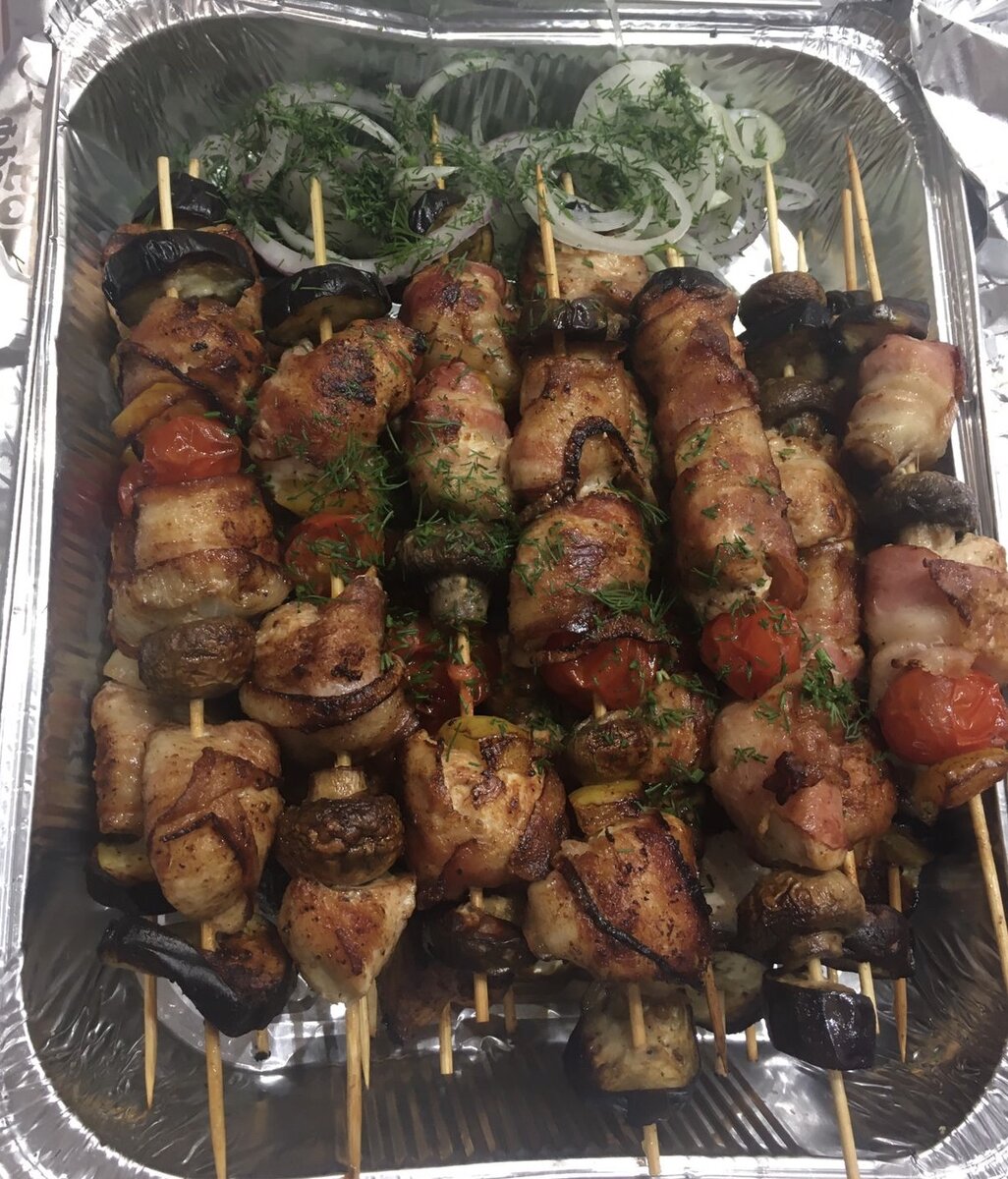 Вариант приготовления импровизированных шашлычков , когда нет времени на мангал . Продукты : -куриное филе 100 гр сырого / на 1 шпажку - бекон 1-2 упаковки -шампиньоны маленькие ,баклажаны , болгарский перец , порезать крупными кусочками -помидоры черри , лук репчатый кольцами толстыми шпажки деревянные , фольгированная форма . Заранее делаем заготовку из мяса , (лучше оставить мариноваться на ночь ) , режем крупным кубиком ,маринуем в смеси соли и приправ : паприка , чёрный перец, сухой чеснок. Замачиваем деревянные шпажки на ночь в воде , что бы не было щепок . Кажый кусочек куриного филе , оборачиваем в полоску бекона . Овощи режем кружочками или крупным кубиком , посолить , поперчить и надеваем поочередно все на шпажки. Жарим шпажки на сковороде ( лучше гриль - квадратная) около 5 минут в общей сложности со всех сторон . Складывать готовые шпажки лучше в фольгированную форму , дольше останутся горячим . Подаем с маринованным лучком и зеленью ! Приятного аппетита!