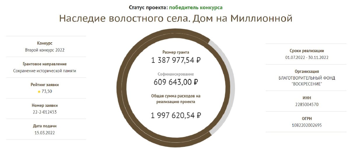 «Наследие волостного села. Дом на Миллионной» - проект НКО «Воскресение» получил поддержку Фонда Президентских грантов.