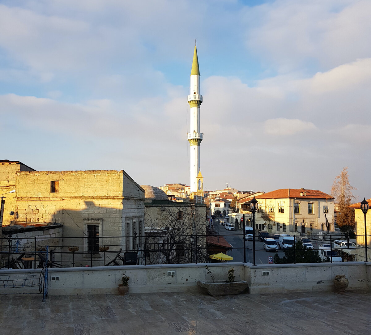 Поскольку Каппадокии усыпана скалами, то площадок, откуда можно полюбоваться её видами, здесь огромное количество. Некоторые из них представляют собой плато, куда подвозят туристов на автобусах, другие же - скалы, которые использовались людьми под жилища или церкви, и поэтому внутри выглядят, как муравейники. Таковыми являются, например, крепости Учхисар и Ортахисар. На последнюю я попала совершенно случайно - меня привез туда пилот воздушного шара Джейхан, потому что там его свёкор со свекровью открыли сувенирную лавку, и он хотел, чтобы я стала первым покупателем. Нужно помнить, что зимой туристов мало, каждый на вес золота! Мы приехали в город на закате. Казалось бы, это самое лучшее время подняться на скалу и полюбоваться заходящим солнцем- но нет, оказалось, что до закрытия осталось всего 25 минут. Мне разрешили войти при условии, что я успею подняться и спуститься. И гонка началась! Вид на мечеть с земли: Вид на мечеть с крепости Я карабкалась вверх аки горная козочка, едв