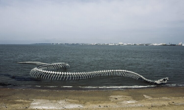 Во французском местечке Сен-Бревен-Ле-Пен, где река Луара впадает в Бискайский залив, во время отлива появляется необыкновенно существо больших, пугающих размеров. «Поселился» гигантский 130 метровый скелет змеи… Откуда он взялся? И Зачем? Эта скульптура змеи из алюминия в длину 130 метров появилась на побережье реки, как символ проникновения китайской культуры в европейскую. Создатель инсталляции Хуан Юн Пин в свое время перебрался из Китая во Францию, так и его змей очутился из китайской мифологии наберу европейском берегу. Ранее в 2012 году эта инсталляция занимала своё место в музее, но ее автор решил её разместить на берегу крупнейшей реки Франции навсегда