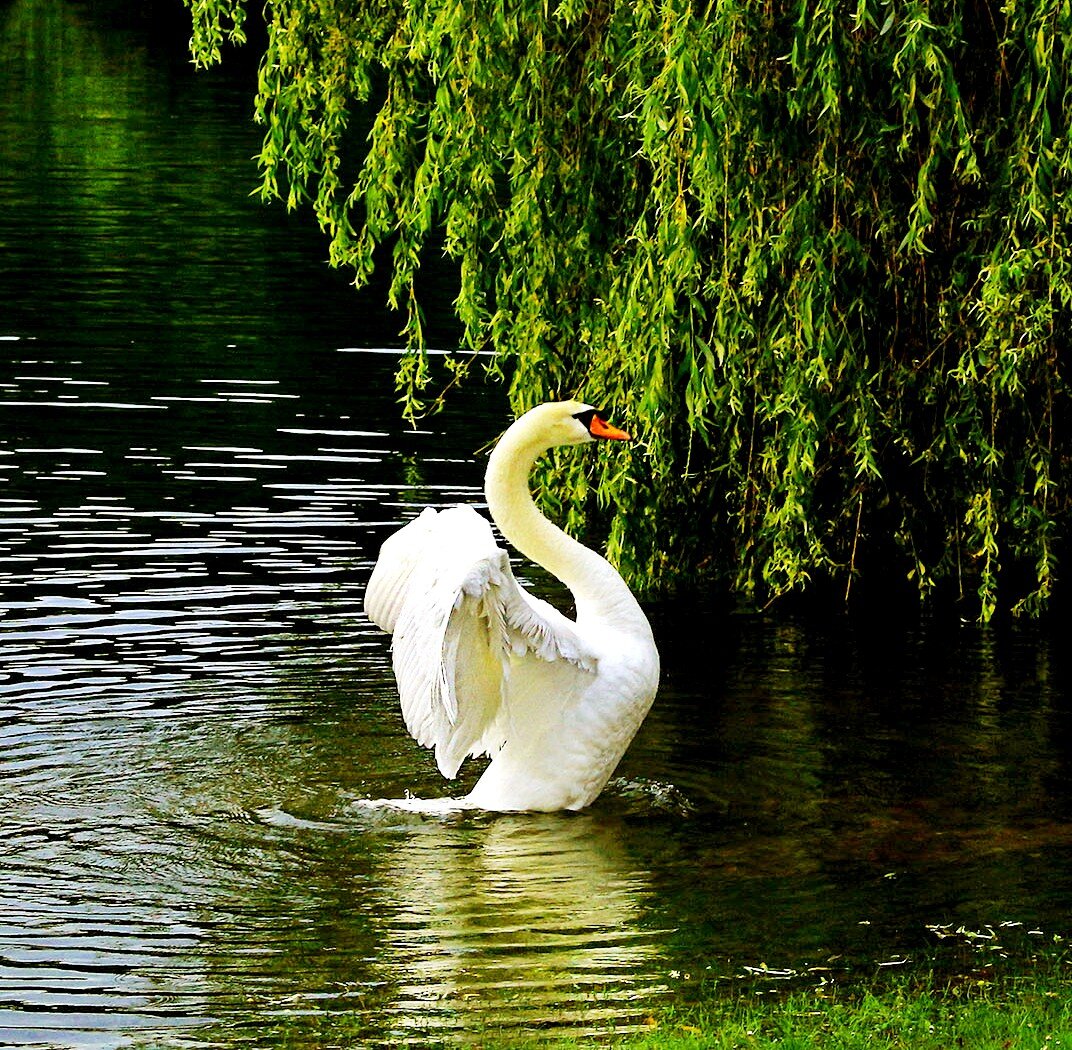 Молодой красивый Лебедь, пролетая над лесом заметил голубое озеро, по берегу усыпанное цветами и ягодами, он подумал: «Какое красивое место, надо его изучить» Он подлетел ближе и почувствовал приятную прохладу, манящий запах свежей травы. В озере была зеркально чистая вода. Молодой Лебедь решил попробовать воду, наклонился к Озеру и увидел в отражении белоснежного красавца, с гордой длинной шеей. Лебедь восторженно любовался своим отражением, он чувствовал радость и силу Молодой Лебедь решил остаться у озера, он полюбил это место за чистоту воды, манящую прохладу и красоту. Озеро тоже полюбило эту гордую птицу и щедро поило и чистило пёрышки Лебедю. С каждым днем молодой Лебедь становился белоснежнее и красивее. Через некоторое время, молодой Лебедь решил полетать: «Я полетаю над лесом и вернусь через сутки», - сказал он. «Я буду ждать тебя мой любимый», -ответило Озеро, переживая за птицу, но понимая, что ему нужен полет. Молодой Лебедь отправился в полет, в небесах он заметил стаю др