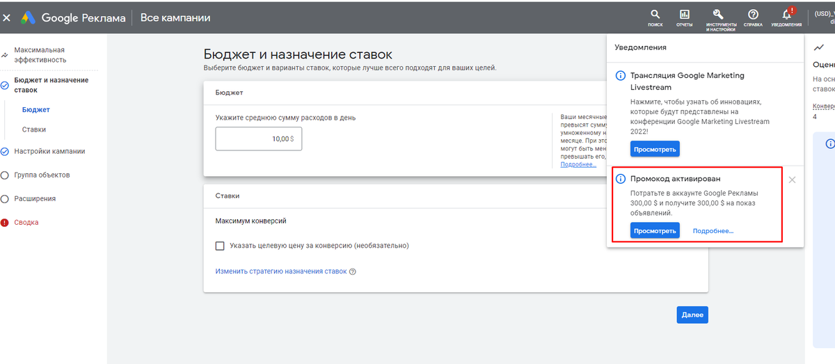 300$ — подарок от Google для новых аккаунтов Гугл Рекламы.