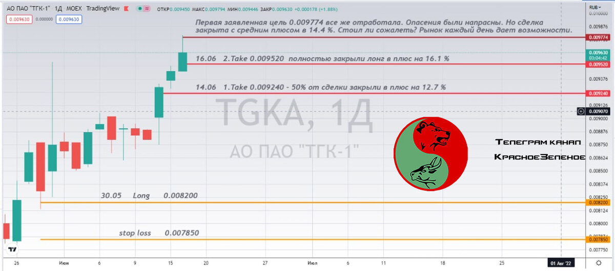 💥Cигнал от 30 мая по #TGKA здесь https://t.me/redsandgreens/48 Коррекция по цели здесьhttps://t.me/redsandgreen/121 - 14.06 1.Take 0.009240 - 50% от сделки закрыли в плюс на 12.7 % - 16.06 2.Take 0.009520 полностью закрыт ЛОНГ в плюс на 16.1 % 💥Да и первая заявленная цель 0.009774 все же отработала. Опасения были напрасны. Но сделка закрыта с средним плюсом в 14.4 %. Стоил ли сожалеть? 💥Рынок каждый день дает возможности.