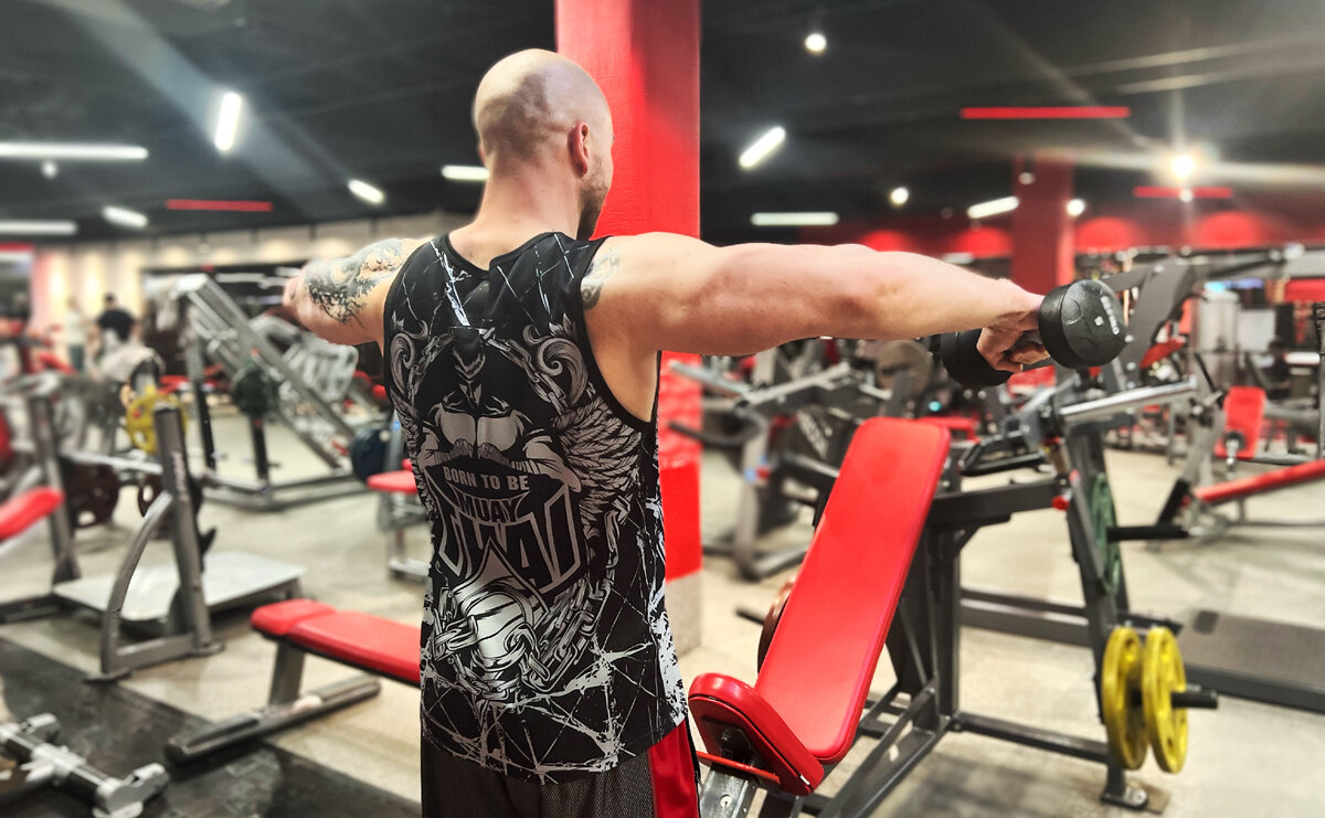 Для гармоничного построения формы плеча и для её округлости, основной пучок, который нужно прорабатывать - это средний пучок. Соответственно, одно из базовых упражнений для прорабатывания среднего пучка дельты - махи гантелей стоя.