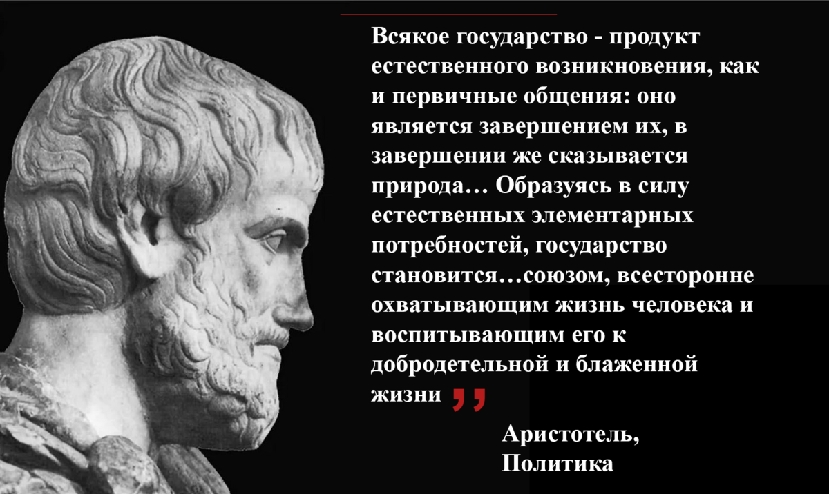 Крайне важно в этом отношении понимать разницу между непосредственными условиями исторической необходимости объединения людей в государство и назначением и сущностью государства. В первом случае Аристотель говорит, что политическое общение людей неизбежно возникает из самых жизненных потребностей человека, образуя почву для возникновения самого государства и относит все это к предпосылкам государственной жизни, но не к его цели и сущности.