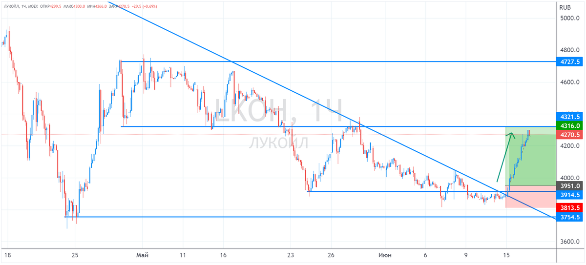 Вчера совместно с пользователями Finrange Premium открыли спекулятивную позицию по акциям Лукойла на 10% от Активного портфеля по цене 3950 руб. Основание для открытия позиции было банальное – пробой нисходящей линии тренда на часовом графике. При этом, изначальный рост акций по нашему мнению был спровоцирован несколькими факторами. Во-первых, по данным Минфин РФ, средняя цена на нефть Urals за период с 15 мая 2022 г. по 14 июня 2022 г. составила $87,5 за баррель. Дисконт Urals относительно бенчмарка составил 25,7% или около $30,3 за баррель. Таким образом, с апреля 2022 г. дисконт сократился почти на 5%. Во-вторых, увеличение поставок нефти в Индию и Китай. Например, Россия уже опередила Саудовскую Аравию и стала вторым по величине поставщиком нефти в Индию. В-третьих, появилась информация, что США и ЕС продолжают закупать российскую нефть. Страны Запада, формально отказавшиеся от российских энергоресурсов, продолжают покупать сырье из РФ, используя всевозможные лазейки и обходные п
