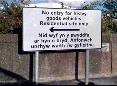 А вот картинка - пример курьезного случая. Английская надпись гласит: "Проезд для грузового транспорта запрещен. Впереди жилой район". Надпись на валлийском: "В данный момент меня нет в офисе. Вышлите текст, который нужно перевести".