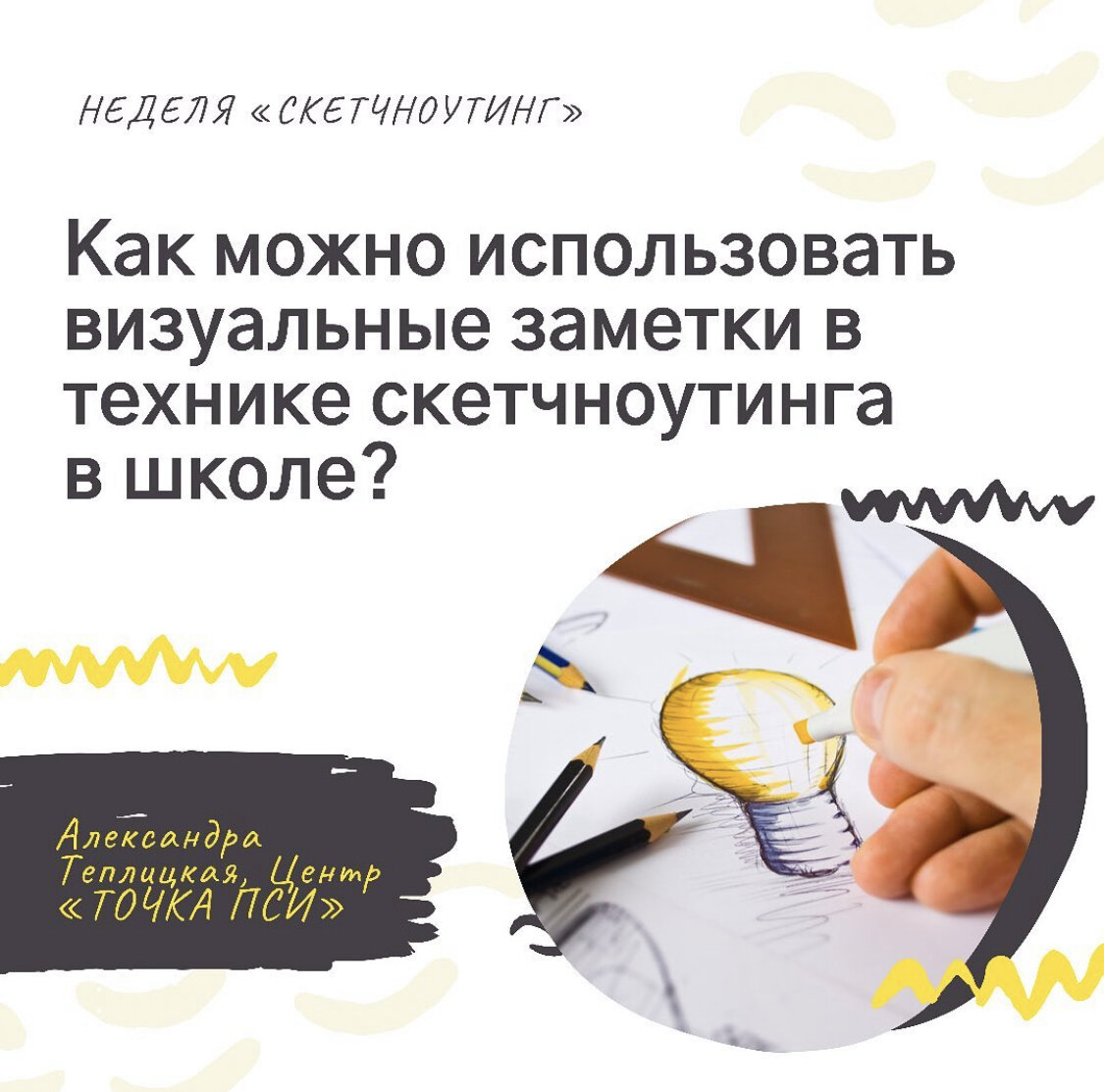 #Скетчноутинг – это техника создания визуальных заметок с помощью системы образов и слов. Зачем она может пригодиться учителю в его повседневной работе? В нашем он-лайн курсе «Скетчноутинг: как просто и эффективно научить детей работать с информацией» мы выделили топ-6 лучших вариантов. Продолжение в галерее ⤵️ Узнать о том, как создавать визуальные заметки, как научить этому детей и сделать свои уроки ярче и эффективнее, вы можете, пройдя наш курс: «Скетчноутинг: как просто и эффективно научить детей работать с информацией» 🟨 Почитать о курсе подробнее и зарегистрироваться можно на сайте проекта: https://tochkapsy.getcourse.ru/sketchnoting