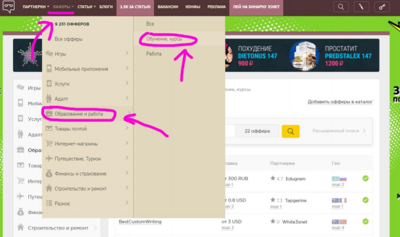 Для начала нам нужно подобрать офферы. Покажу алгоритм работы на примере одного, чтобы не засорять мануал примерами. Переходим на сайт partnerkin.com (РКН положил сайт, работает с VPN). Далее, следуем скриншоту ниже: