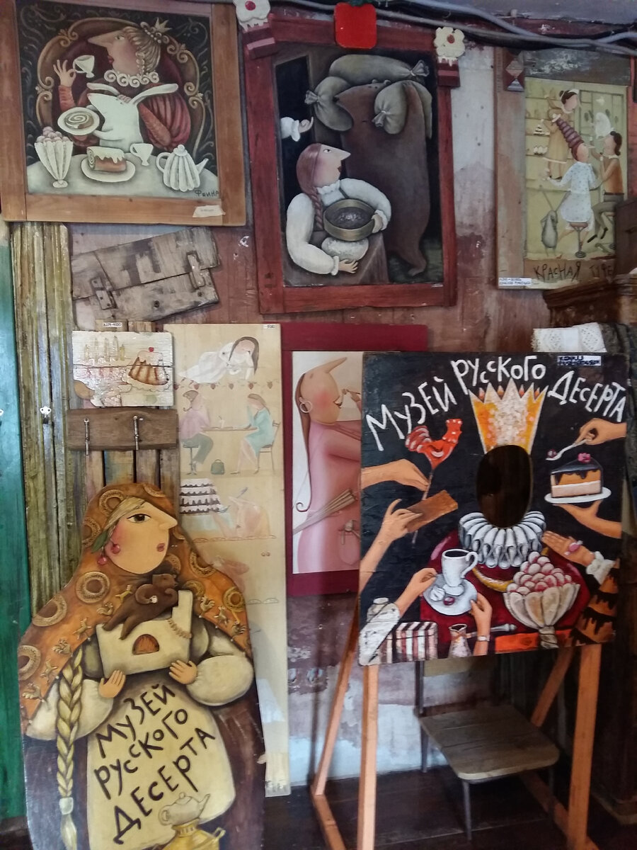 Я люблю частные дома в русском стиле. Самой пожить возможности не представилось, но вид и атмосфера очень нравятся. В музее русского десерта, находящегося в Звенигороде, можно увидеть предметы быта, которыми мы давно не пользуемся, а так же прикольные картины, некоторые очень милашеские. Я не поняла стиль автора, писавшего эти картины. На нем девушки изображены слишком уж неестественно. Все с острыми носами и утиные губы. Зато здесь в подробно представлен инструменты, которыми раньше пользовались в быту. Помимо экскурсии можно заказать мастер класс по изготовлению вкуснях. Я этого не сделала, но видела семью, которая как раз такой мастер класс проходила. И запах был волшебный. На втором этаже большой выбор самоваров. Даже как то грустно видеть, как они стоят длинным рядом, а никто из них не пьет. Эх, знатную можно устроить вечеринку в этом доме. И весьма атмосферную.