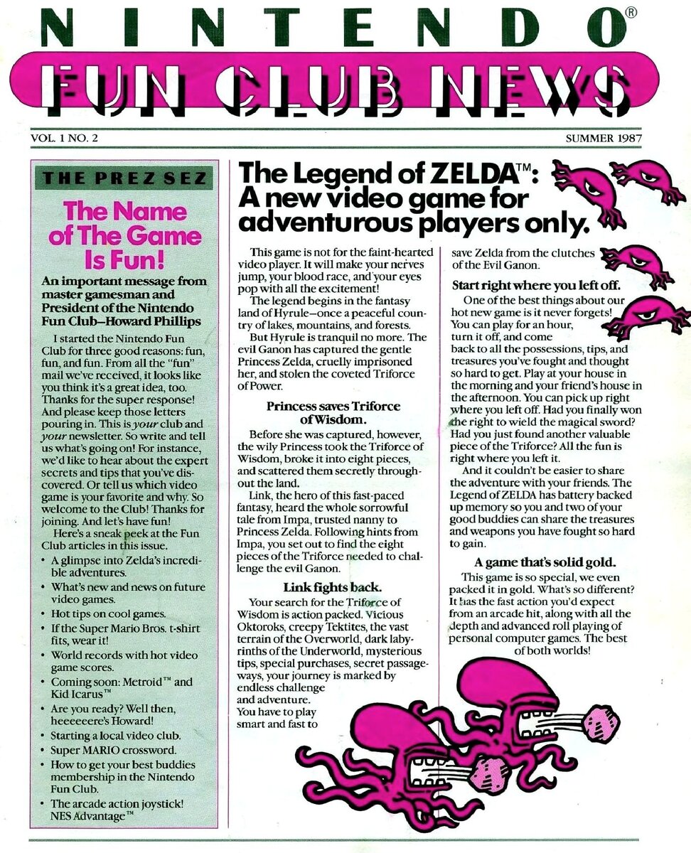 Это перевод статьи про игру Legend Of Zelda из газеты Nintendo Fun Club News американского отделения Nintendo. Легенда о ЗЕЛЬДЕ: Новая видеоигра только для отважных игроков. Эта игра не для слабонервных игроков. Она заставит ваши нервы кипеть, вашу кровь бурлить, а ваши глаза лопнут от восторга! Легенда начинается в сказочной стране Хайрул - некогда мирной стране озер, гор и лесов. Но Хайрул больше не спокоен. Злой Ганон захватил в плен милую Принцессу Зельду, жестоко заключил ее в тюрьму и украл желанную силу Трифорс. Принцесса спасает Трифорс Мудрости. Однако, прежде чем ее схватили, хитрая принцесса взяла Трифорс Мудрости, разбила его на восемь частей и тайно разбросала их по всей стране. Линк, герой этой быстро развивающейся фэнтези, услышал всю печальную историю от Импы, доверенной няни принцессы Зельды. Следуя подсказкам от Импа, вы отправляетесь на поиски восьми частей Трифорса, необходимых для того, чтобы бросить вызов злому Ганону. Линк сопротивляется. Ваши поиски Трифорса