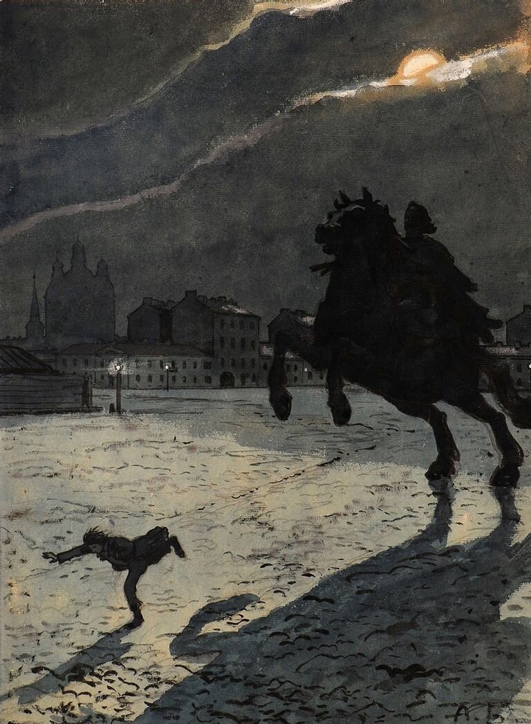 А теперь посмотрим, как Петербургский текст выглядит, собственно, в тексте. Принято считать, что первым собрал в целое основные его образы Пушкин (кто же ещё). Конечно, это не случилось на пустом месте: его элементы входили в литературу постепенно, многие были основаны на городских легендах почти столетней давности. Но в Болдинскую осень 1833 года действительно были написаны два текста, где Петербург уже выступил в качестве самостоятельного героя. Это “Медный всадник” и “Пиковая дама”.