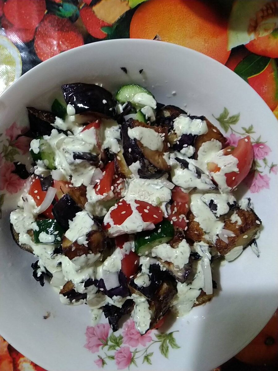 Летом не всегда хочется кушать🤭 но, нужно. Поэтому я часто делаю себе такой вот ужин ну или завтрак, обед😂 #салат #закуска #ужин #меню #вдохновение Ингредиенты: Баклажан, Помидор, Огурец, Лук репчатый, Зелень (у меня базилик), Сметана, Чеснок, Кунжут или орехи (по желанию), Соль по вкусу Способ приготовления: Баклажан нарезать крупными кусочками, обвалять в муке или крахмале, обжарить на растительном масле до красивой корочки. Нарезать лук, помидор, огурец и добавить к остывшим баклажанам. Солим чуть чуть. Перемешать. Добавить зелень. У меня мой любимый базилик. Делаем заправку: в сметану я добавила укроп, чеснок, соль и пробила блендером. Далее, пробуйте заправку. Если вас устраивает вкус, то заправьте ваш салат. Также, по желанию можно добавить орехи или как в моём случае кунжут. Наслаждайтесь. Приятного аппетита!!!