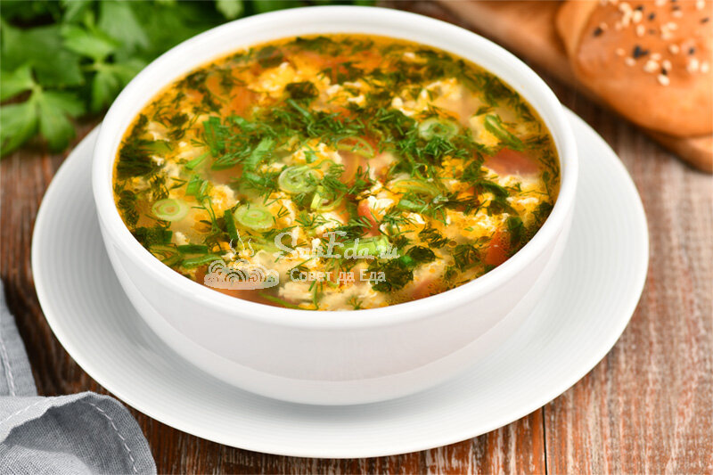 Отличный суп без мяса и рыбы, готовится всего 10 минут. Для него потребуется небольшое количество продуктов. Конечно, готовить его можно в любой сезон. Называю его летним, так как использую много зелени, он легкий, подавать его можно горячим или теплым и плиту для его приготовления включаю не дольше, чем на 10 минут. Суп получается сытный, очень ароматный и вкусный. Порции 2 Время подготовки 10 минут Время приготовления 10 минут Ингредиенты Инструкции 1. У помидора делаем крестообразные разрезы, перекладываем в миску, заливаем кипятком на 30 секунд и удаляем кожицу. 2. Помидор нарезаем кубиками, выкладываем в масло в ковш (объем 1,2 литра) и готовим 3 минуты, помешивая. Если помидор кислый, то добавляем небольшую щепотку сахара. 3. Добавляем нарезанные зубчики чеснока и готовим еще 1 минуту. 4. Вливаем почти до краев ковша горячую воду, солим и перчим. 5. Яйца взбиваем вилкой и переливаем в емкость с носиком. 6. Тонкой струйкой вливаем яйца в суп, перемешиваем и варим после закипания 1